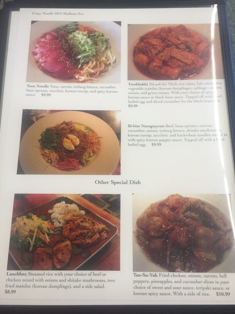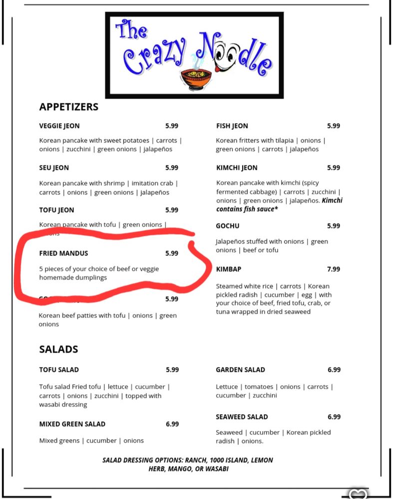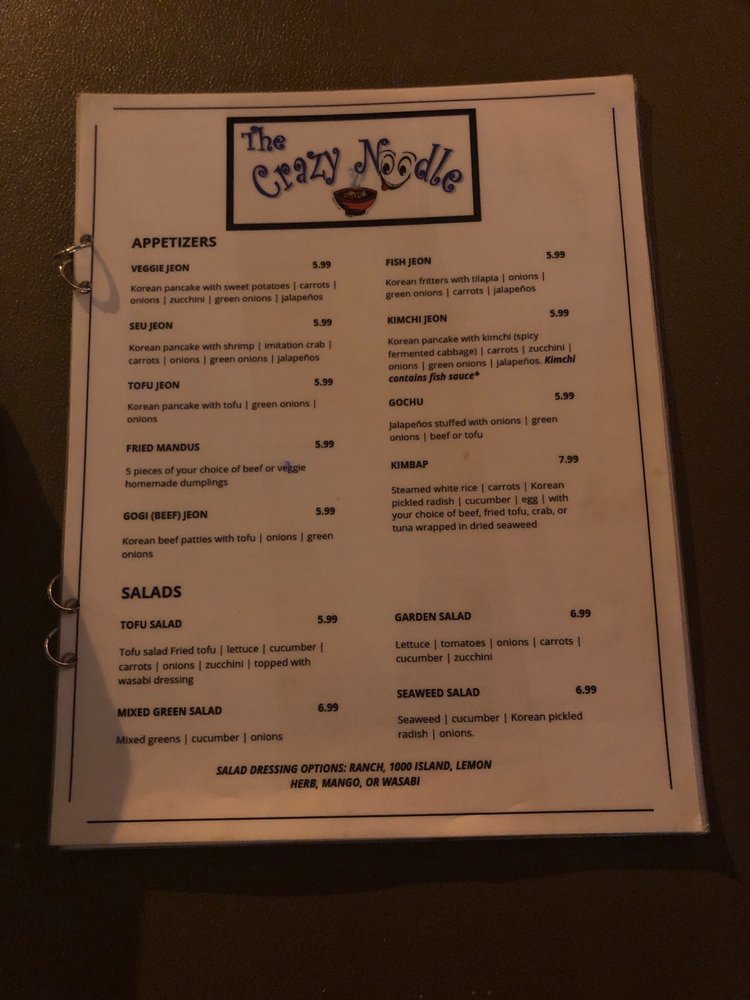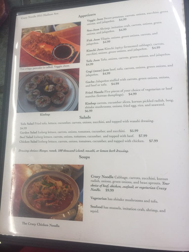 Introducing the menu at The Crazy Noodle, a Korean noodle soup restaurant located in Memphis, TN. This Asian-owned gem offers a variety of vegan and vegetarian options, along with beer and wine choices. The extensive menu includes appetizers like Korean Steam Buns and Fried Mandus, as well as soups like Crazy Noodle Soup and Jjamppong. Customers rave about the freshness and flavor of the dishes, with some favorites being Mandu ramen and beef bulgogi. The efficient service and cozy ambiance make dining at The Crazy Noodle a delightful experience. Visitors can also enjoy outdoor seating and happy hour specials. This hidden gem is a must-visit for those craving comforting and delicious Korean cuisine in Memphis.